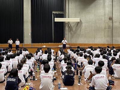 2年生 水上自然教室⑦ 投稿: 戸塚中学校 (2023/09/12) カテゴリー: 学校行事 レク係の考えてくれた学年レクを楽しみました。 その後の係会議・班会議では1日の振り返り、明日の動きの確認をしました。 夕礼では今日の反省と明日の連絡を行いました。 この後就寝します。